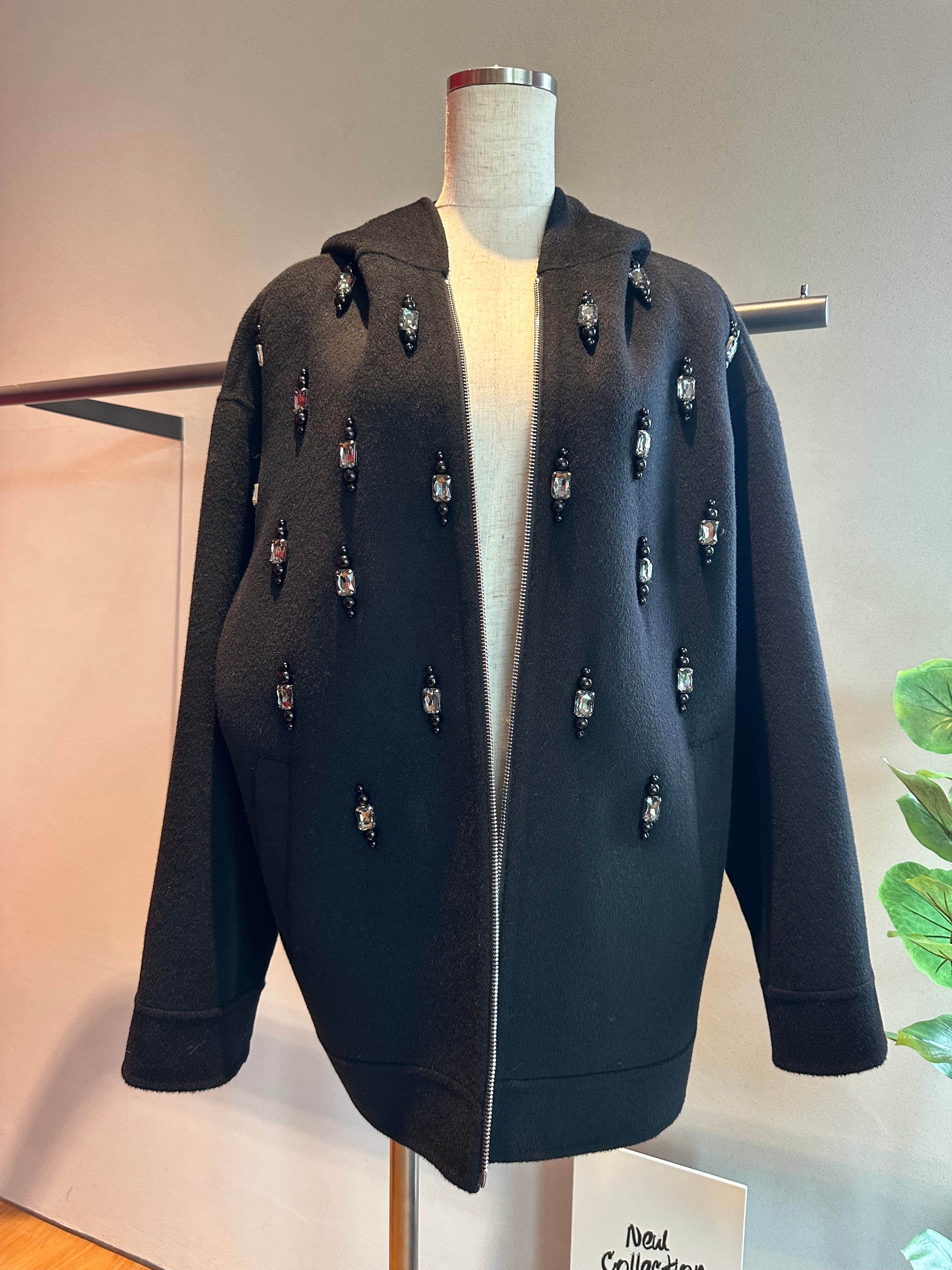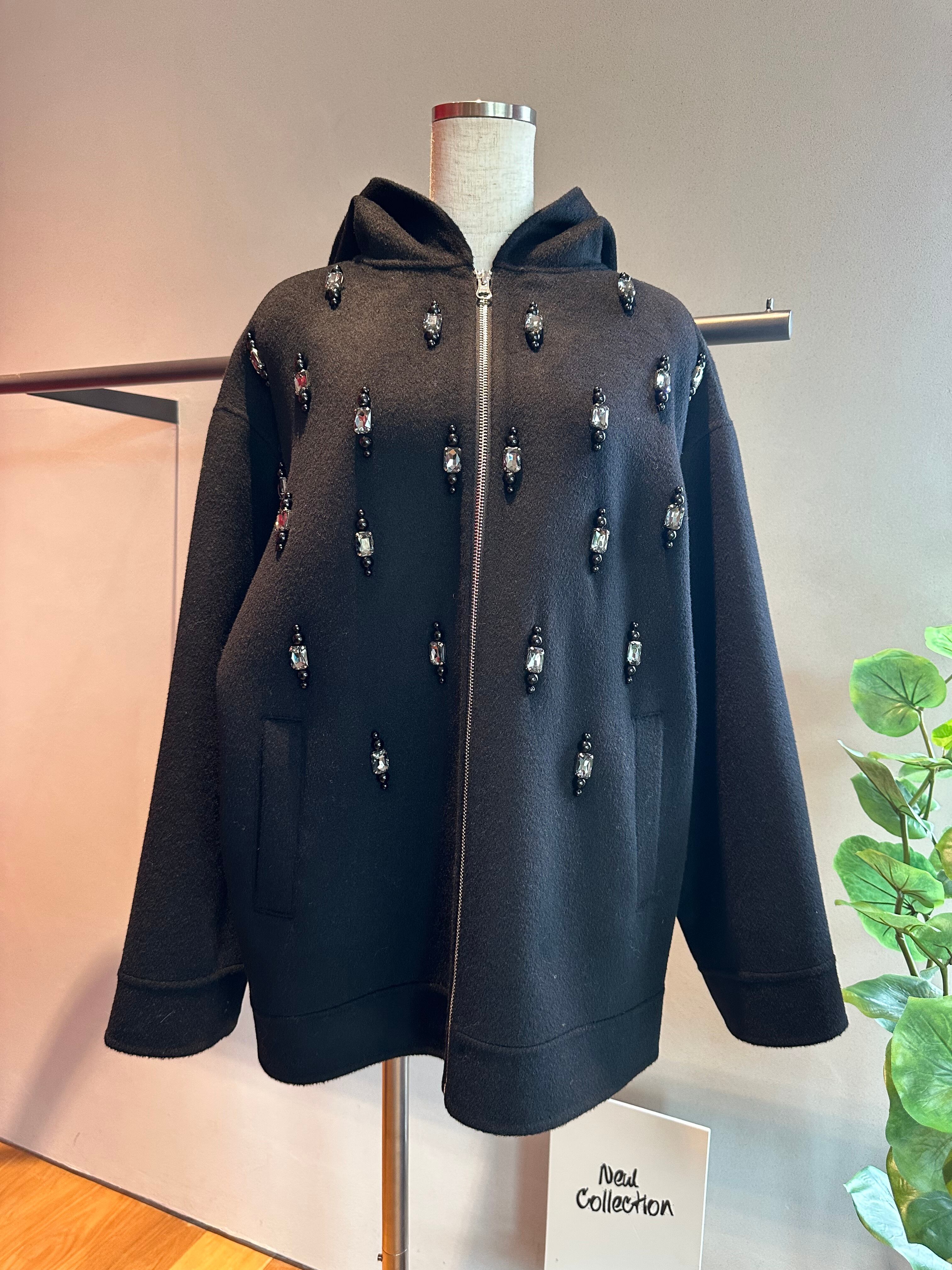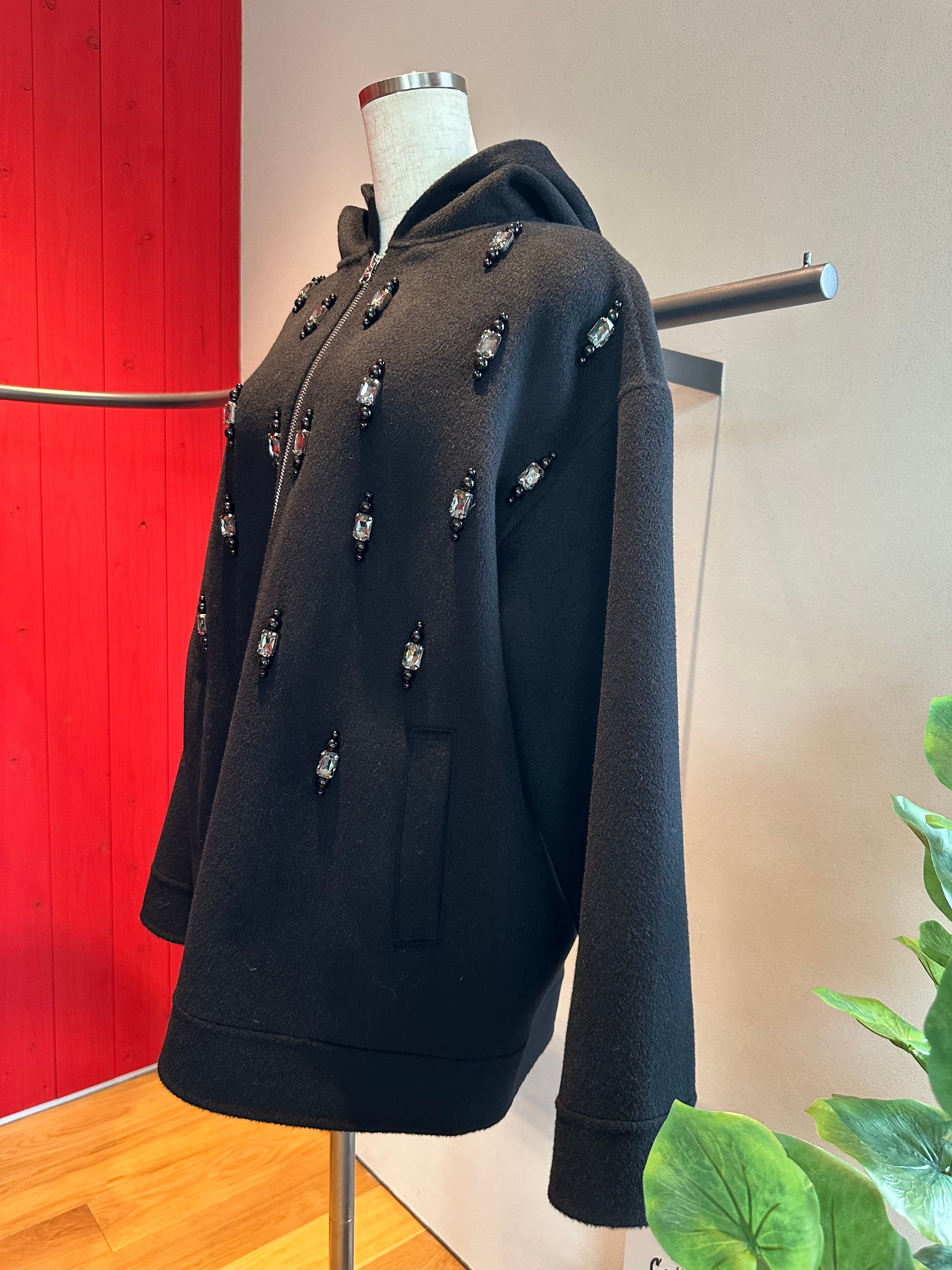 ウールフラノビジューデザインフードZIPミドルコート