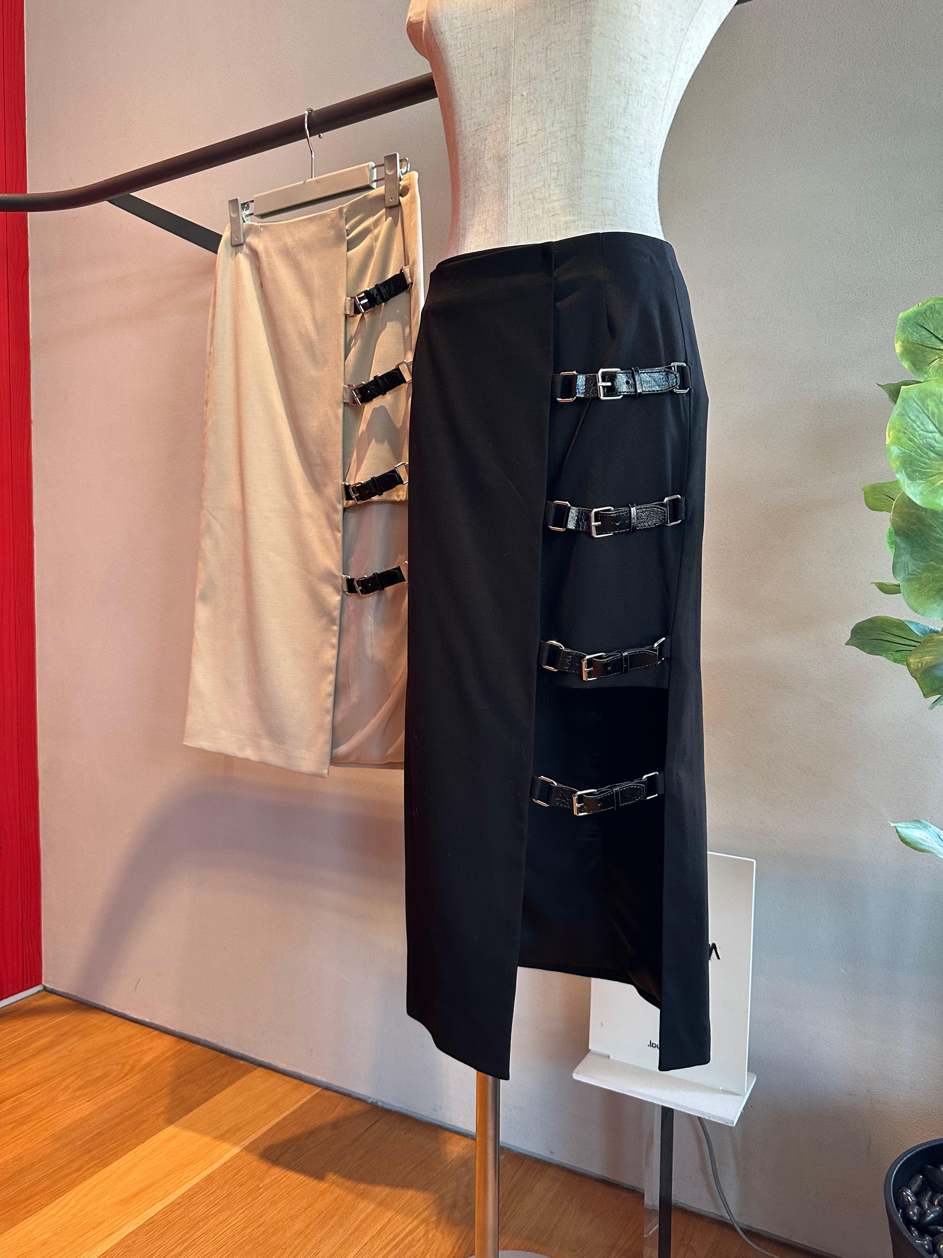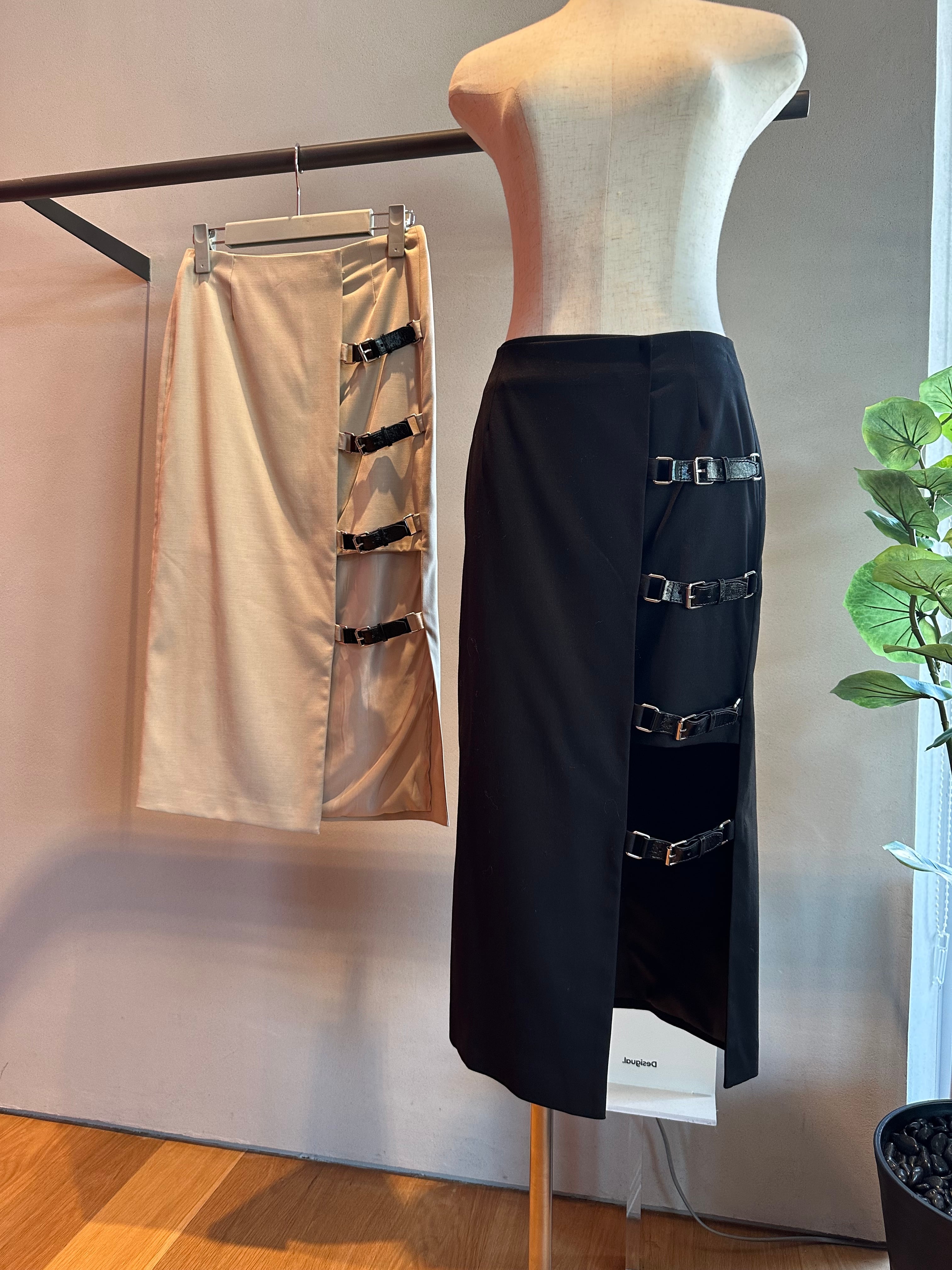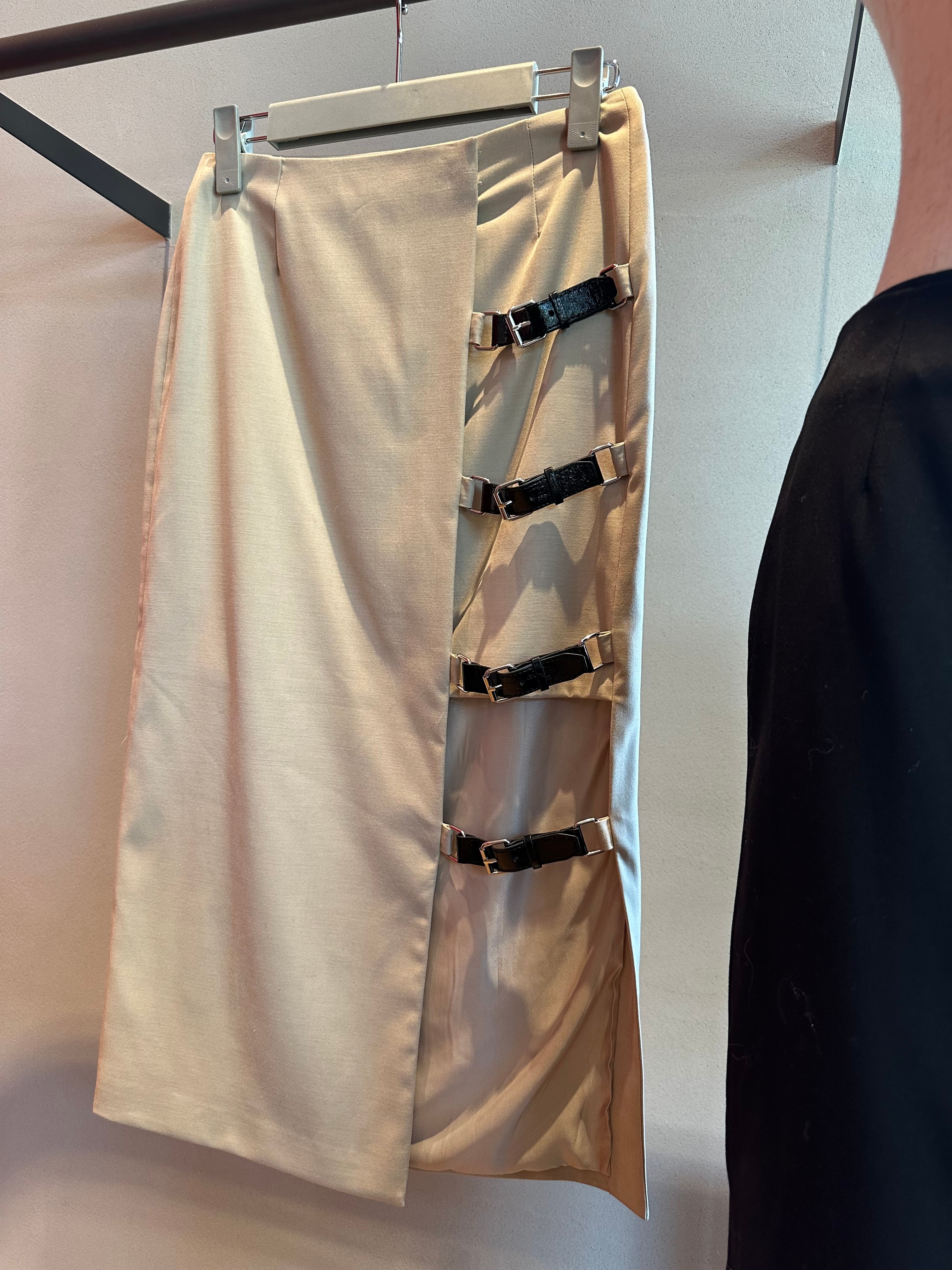 【OUTLET】ウール混サイドレザーベルトデザインミディー丈SK