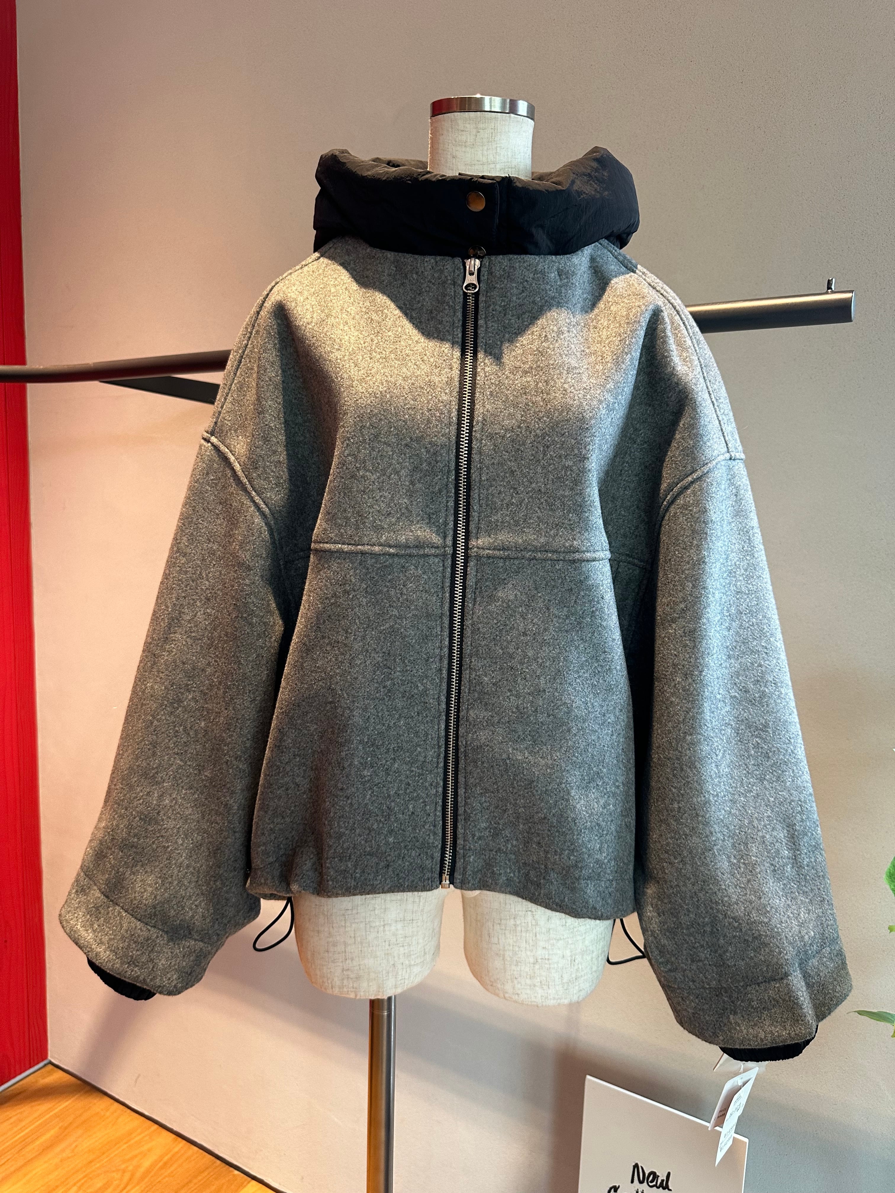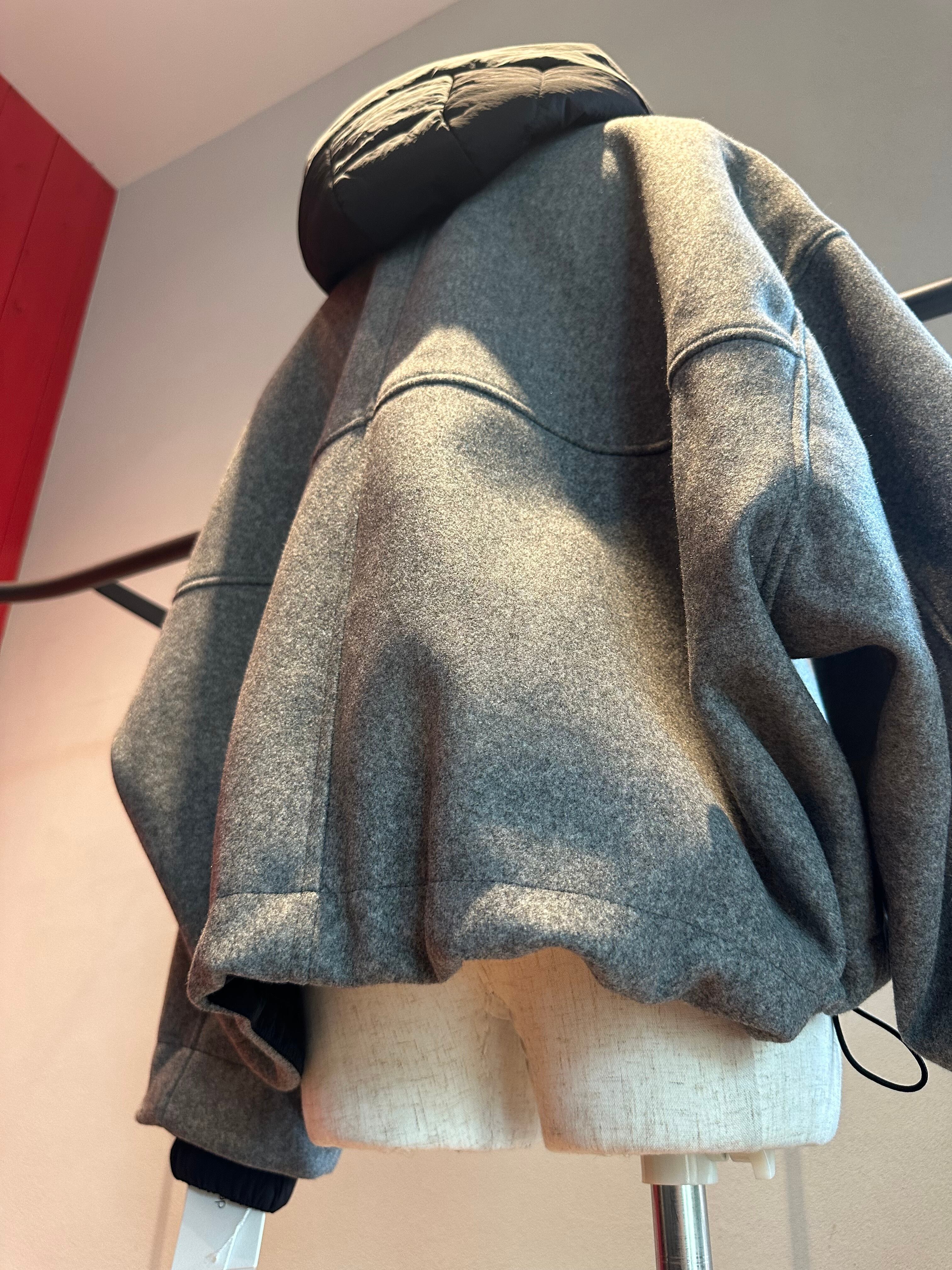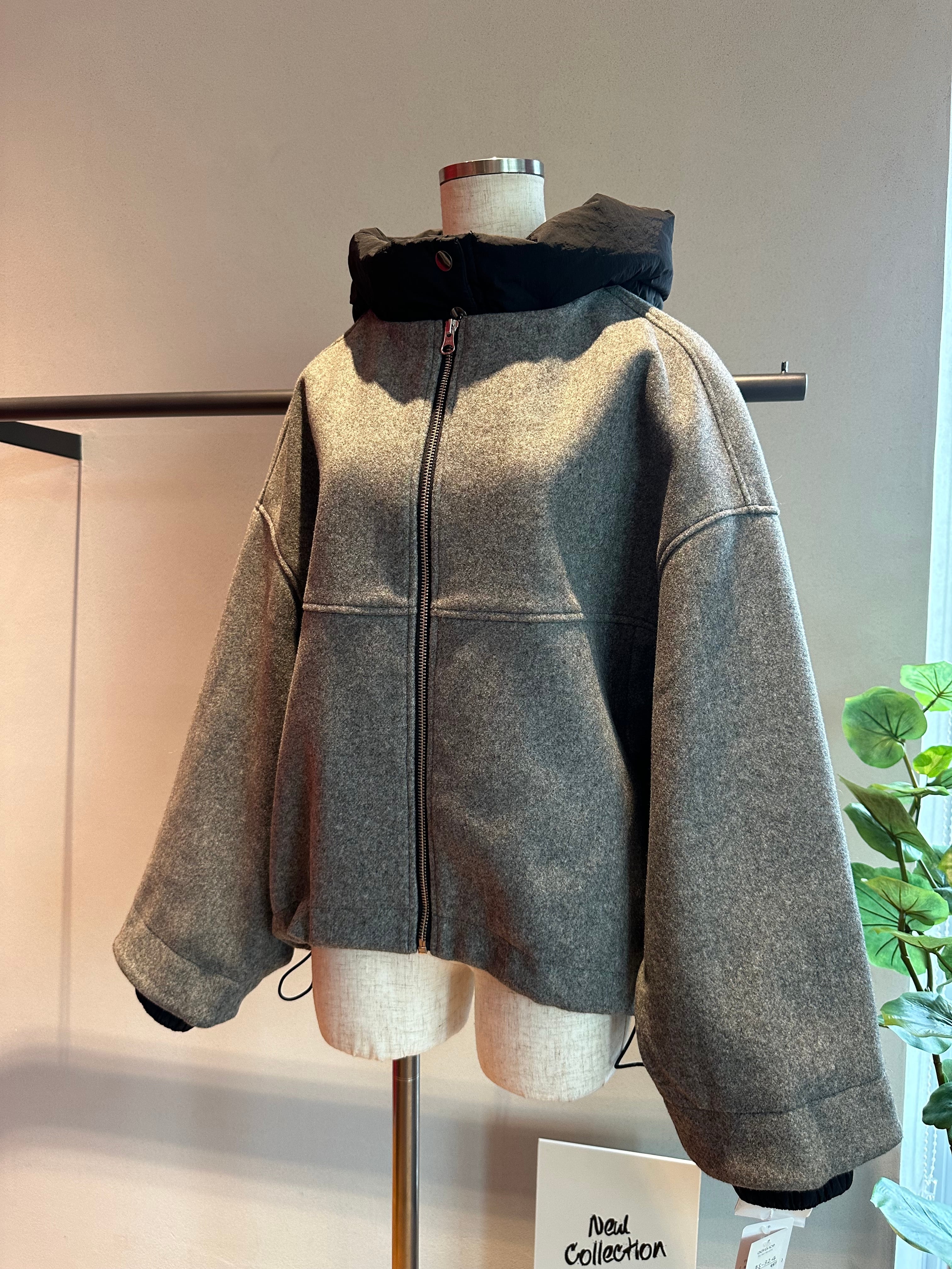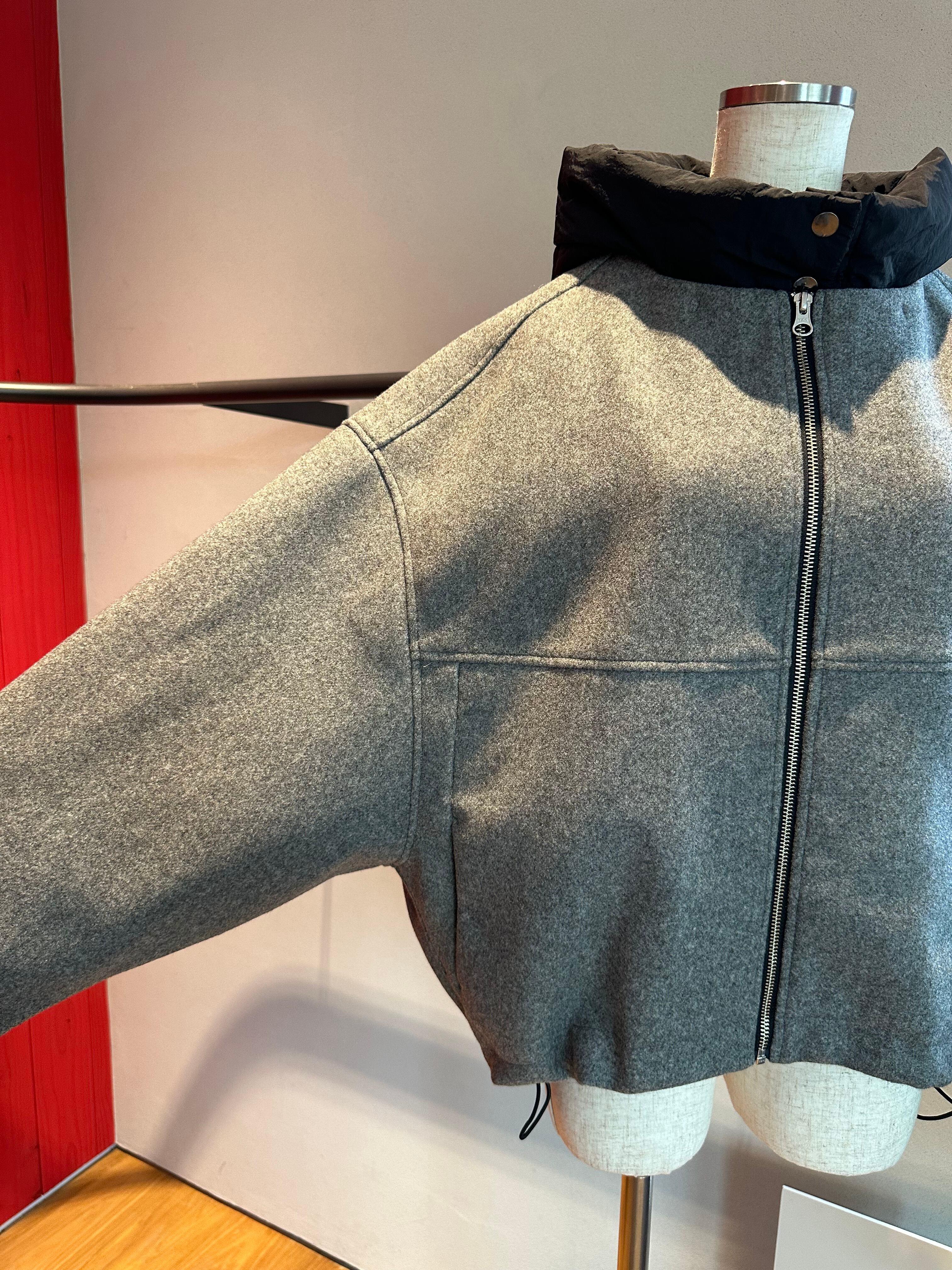 タフタフード袖取り外し裾ドロストノーカラーZIPメルトンブルゾン