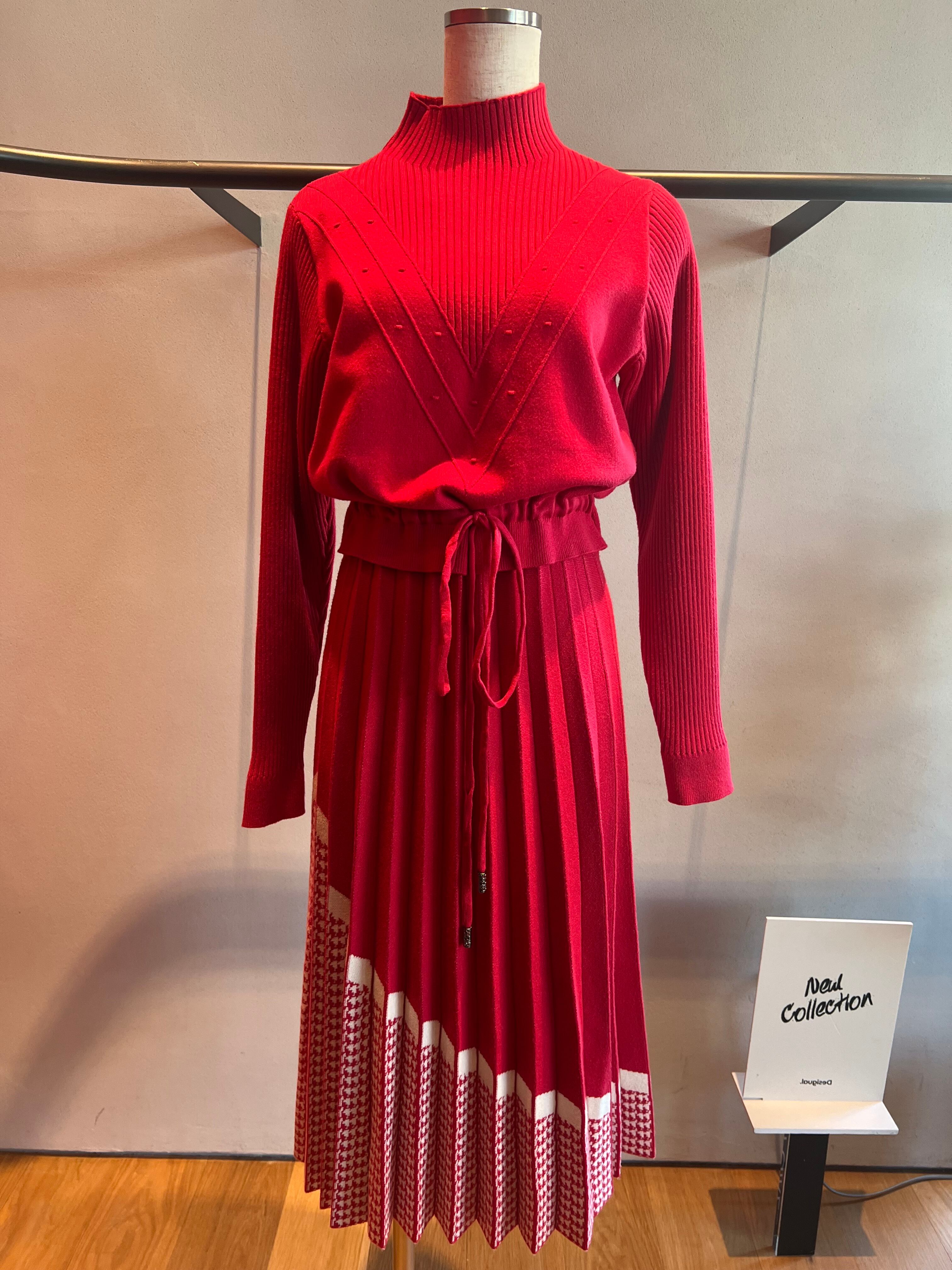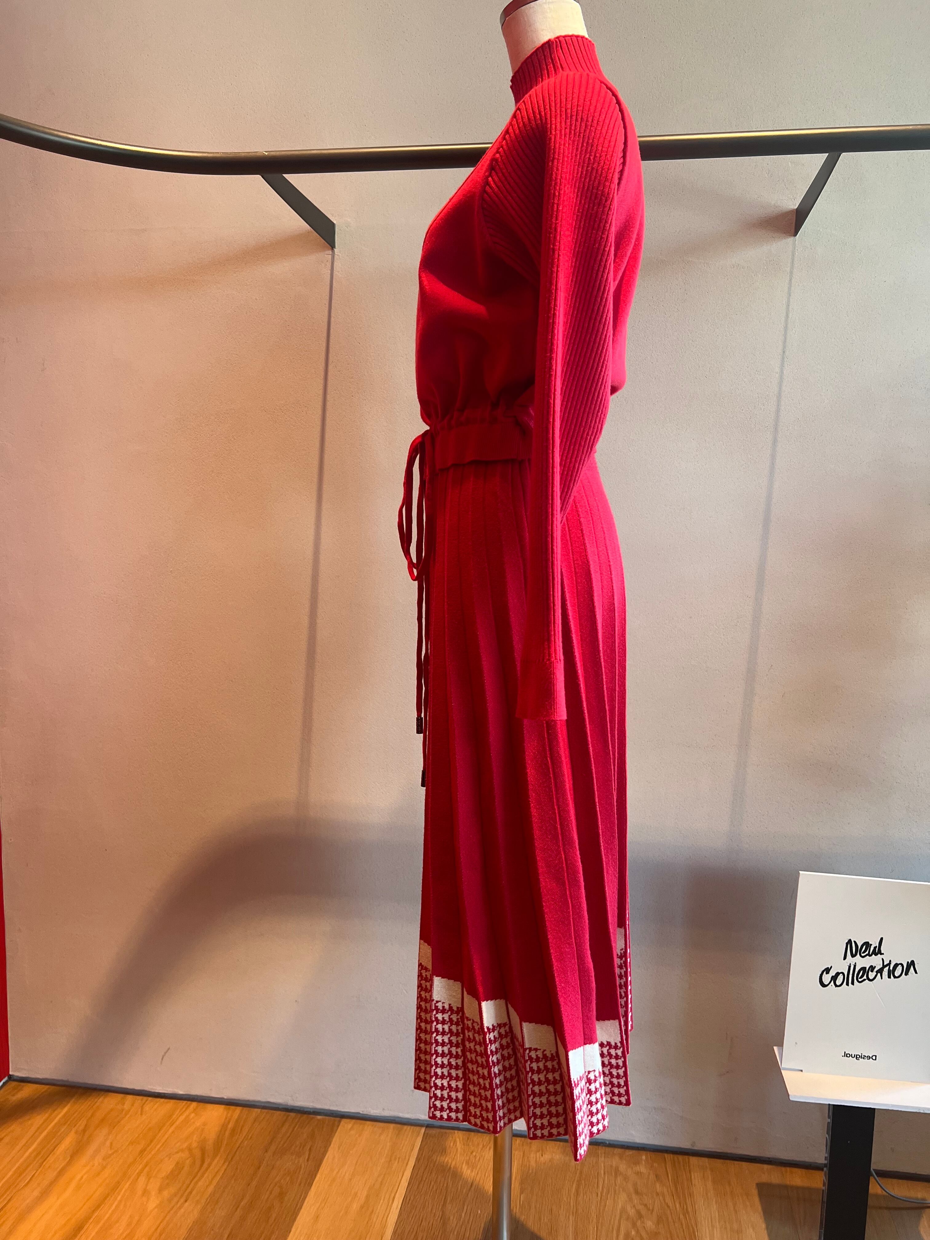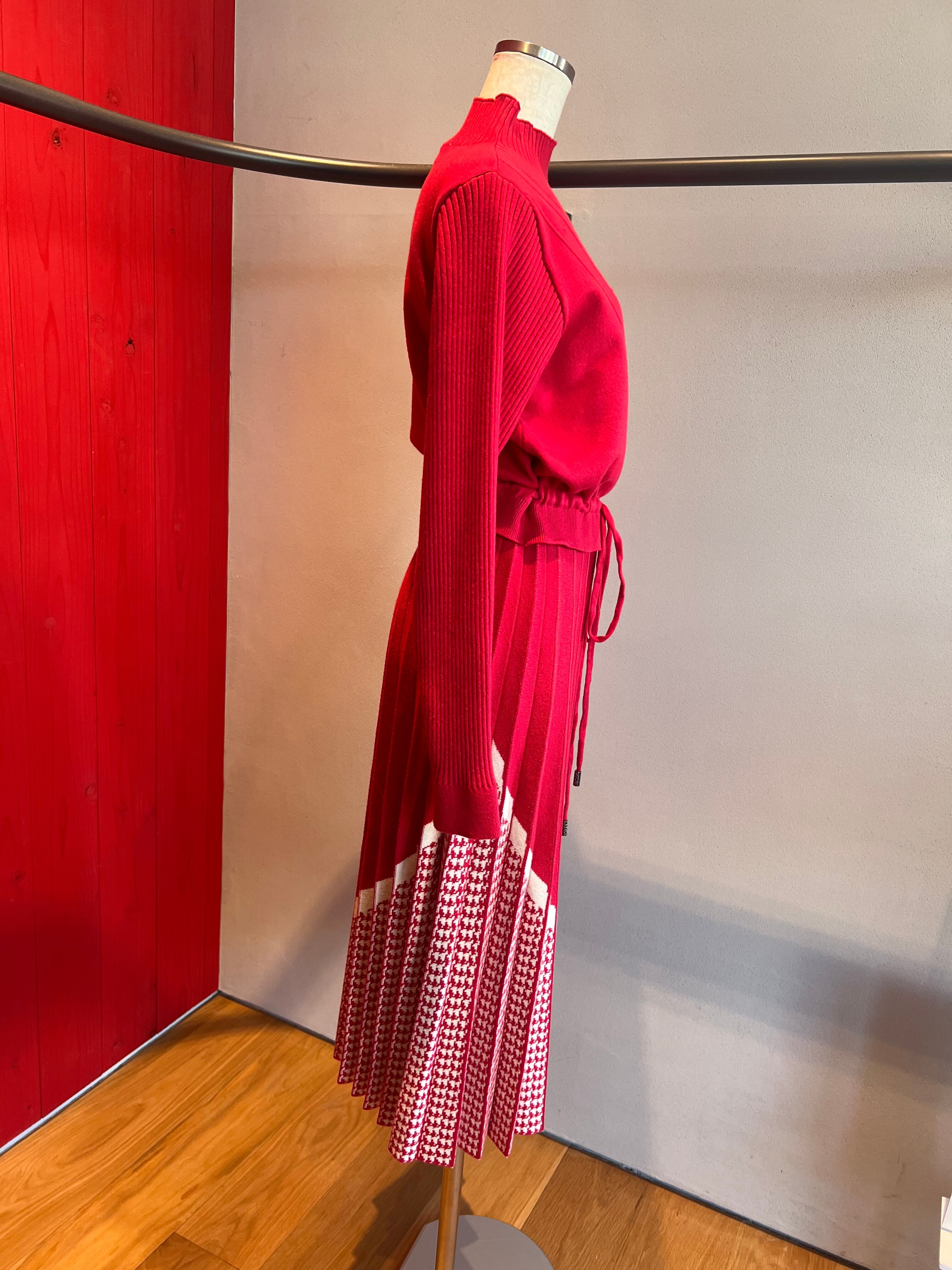 裾千鳥柄プリーツハイネックウエストドロストニットワンピース