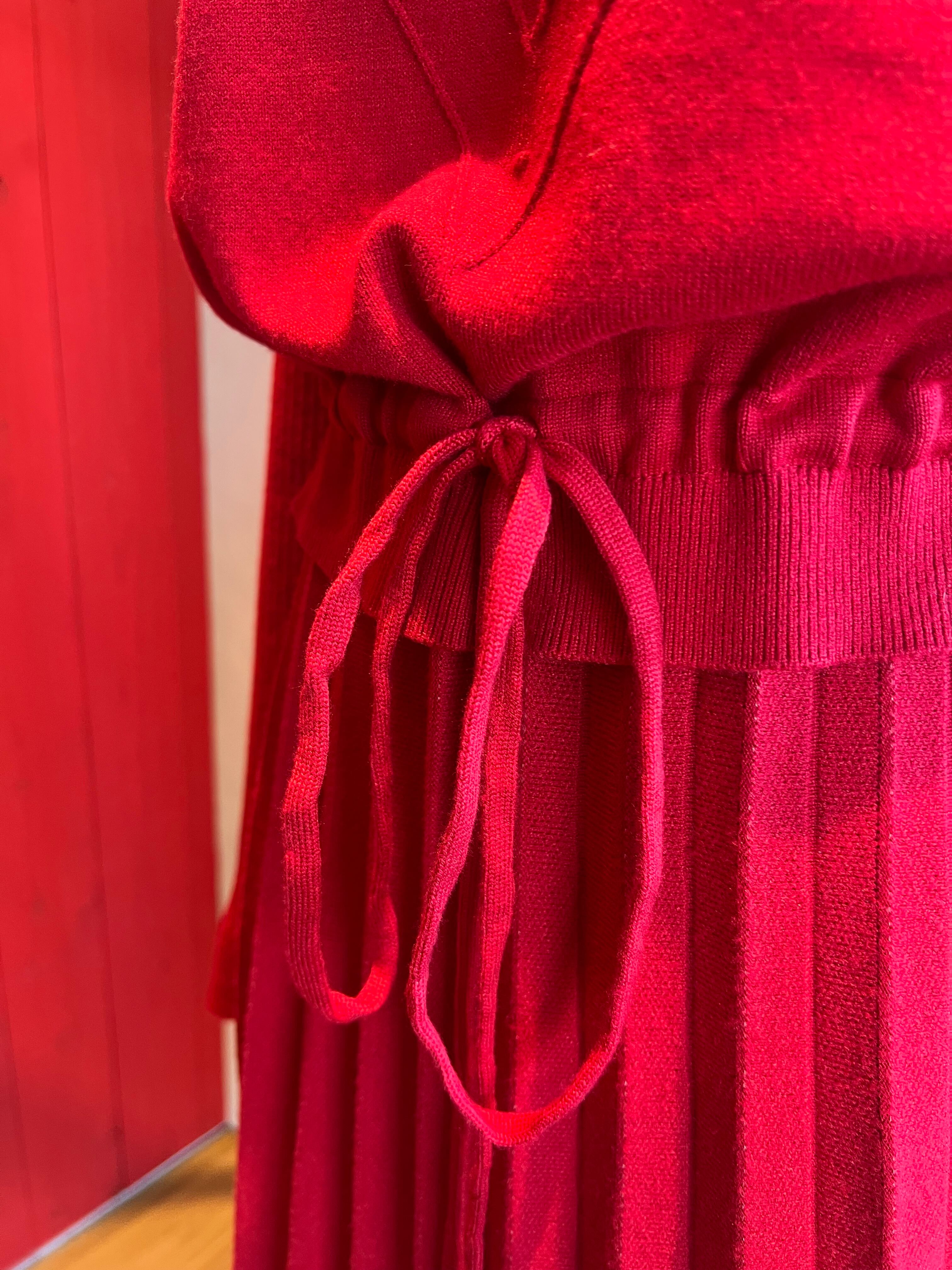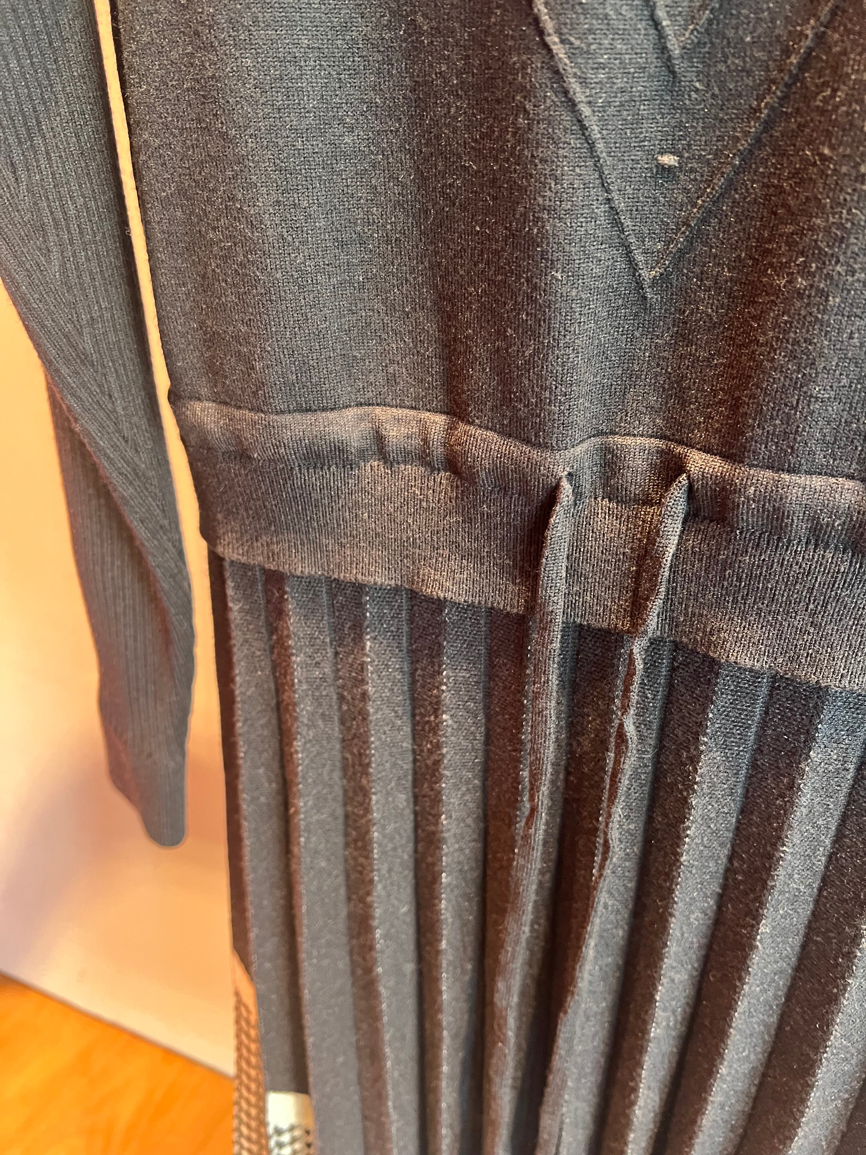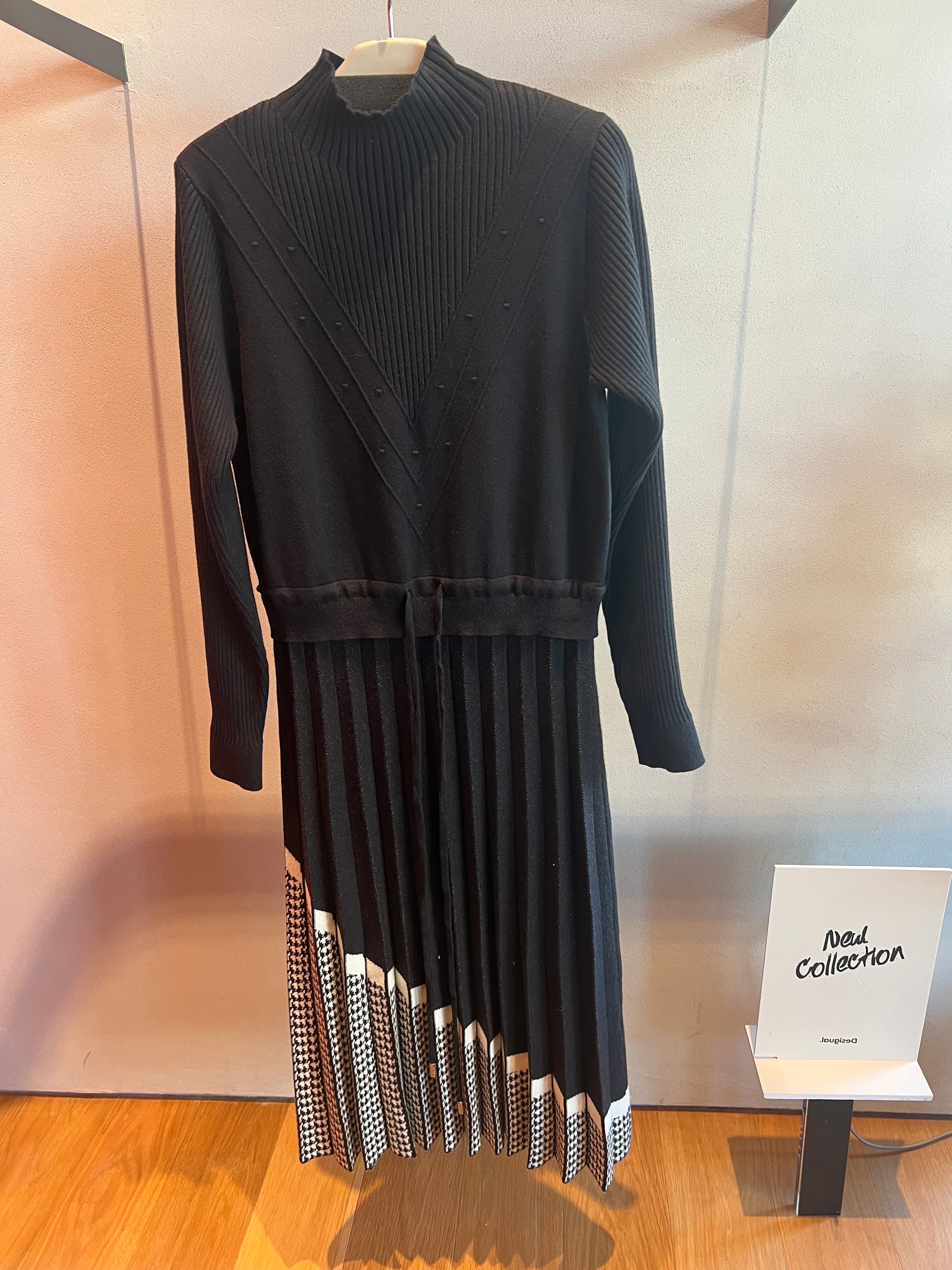 裾千鳥柄プリーツハイネックウエストドロストニットワンピース